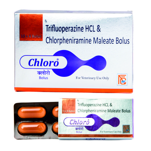 Each uncoated bolus contains: Trifluoperazine HCL I.P Eq. to trifluoperazine-50mg chlorpheniramine maleate I.P.-250mg Domperidone I.P-30mg calcium bromide-100mg cyanocobalamin I.P-50mcg Excipients q.s.